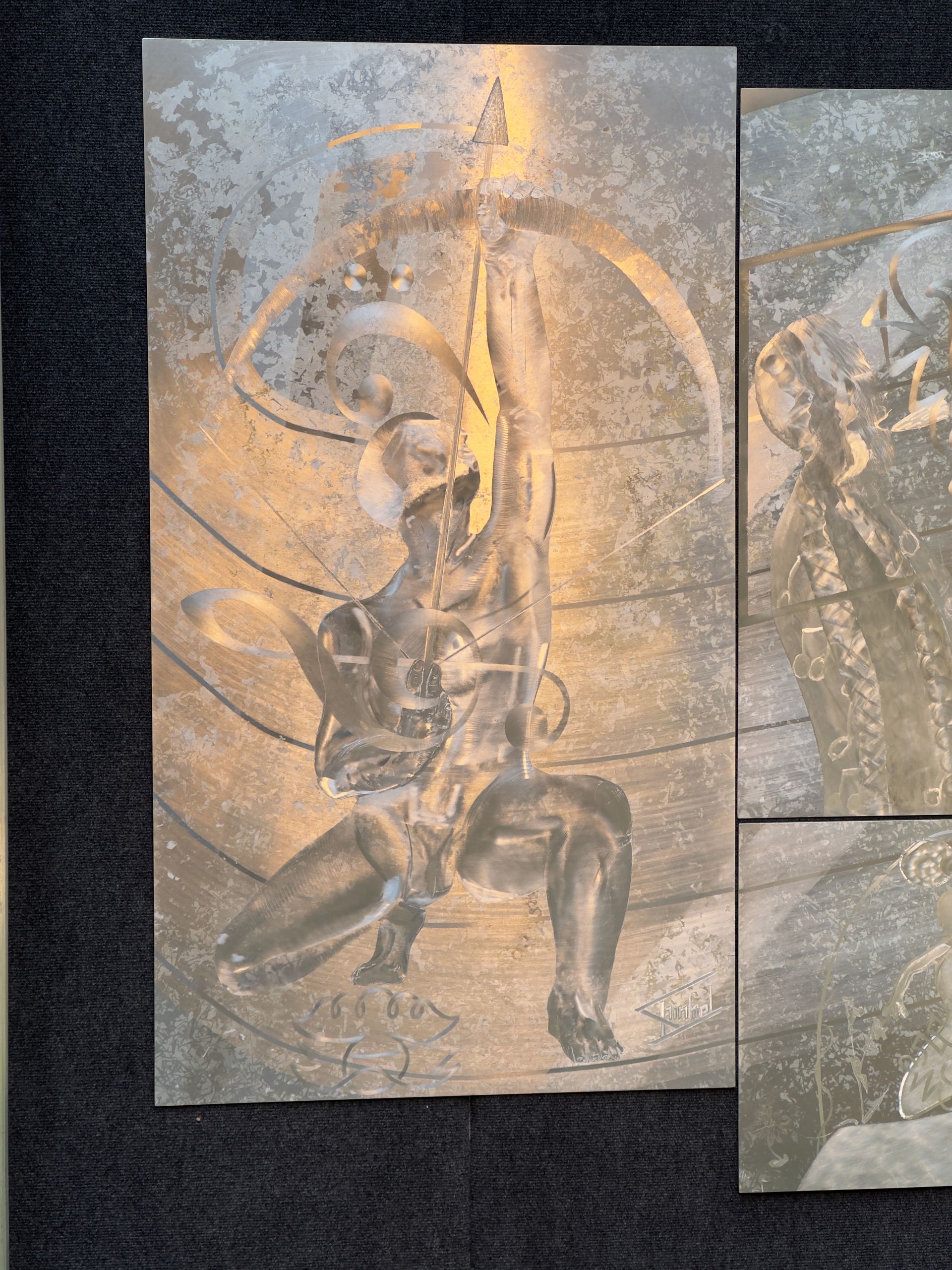 Cultivation in the Garden transports and evokes feelings in viewers of the sublime. This work is inspired by the novella, “Night in the Garden of Love”, by Dr. Yusef Abdul Lateef, a Detroit native, and created during the “Angles of Incidence” summer class taught by the Schinkel's during their Cranbrook summer residency. The students learned how to use sculptural layered hands-on techniques, using the Schinkel’s original artist process, to create their physical and digital designs onto the aluminum. The characters and features in the collaborative work were created and designed by Detroit Public High School students during Cranbrook Horizons Upward Bound program and inspired by Dr. Lateef's novella.
